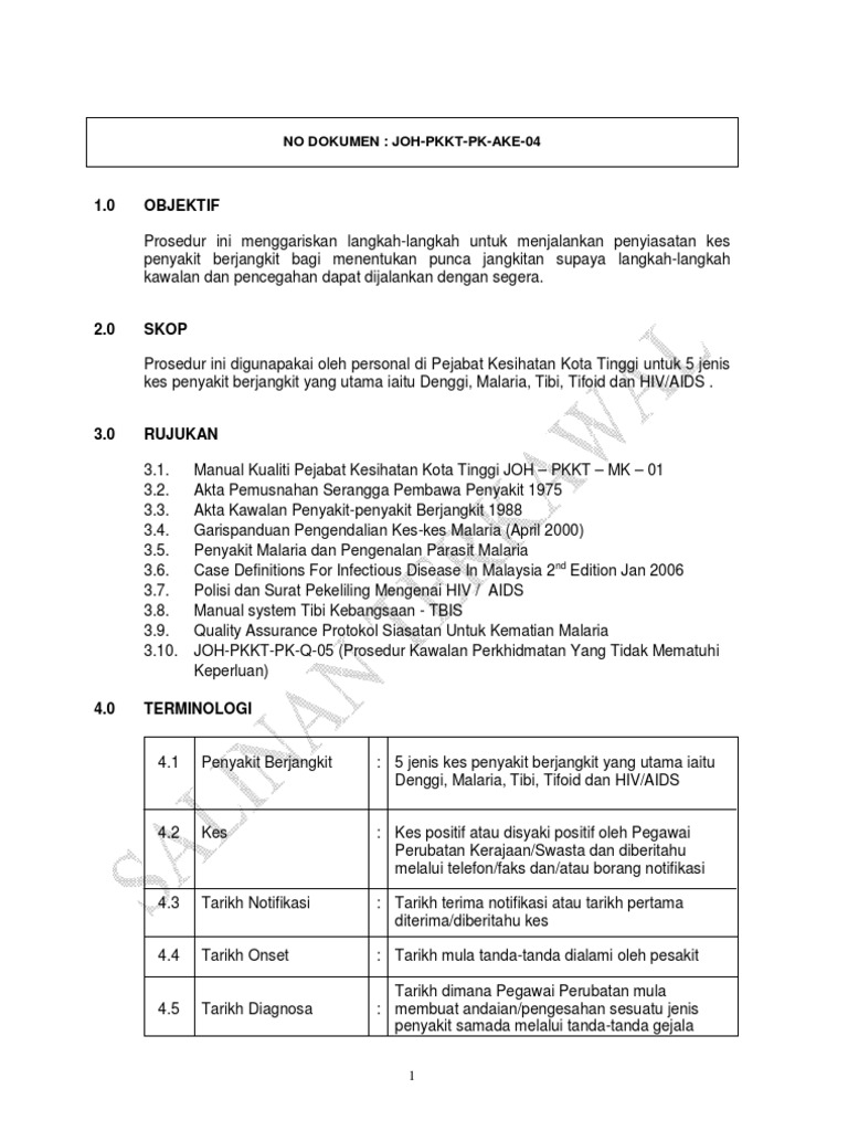 Kementerian Kesihatan Malaysia Pejabat Kesihatan Kota Tinggi Johor Prosedur Penyiasatan Kes Penyakit Berjangkit No Keluaran 04 No Rujukan Joh Pkkt Pk Ake04 No Pindaan 02 Tarikh Kuatkuasa 15