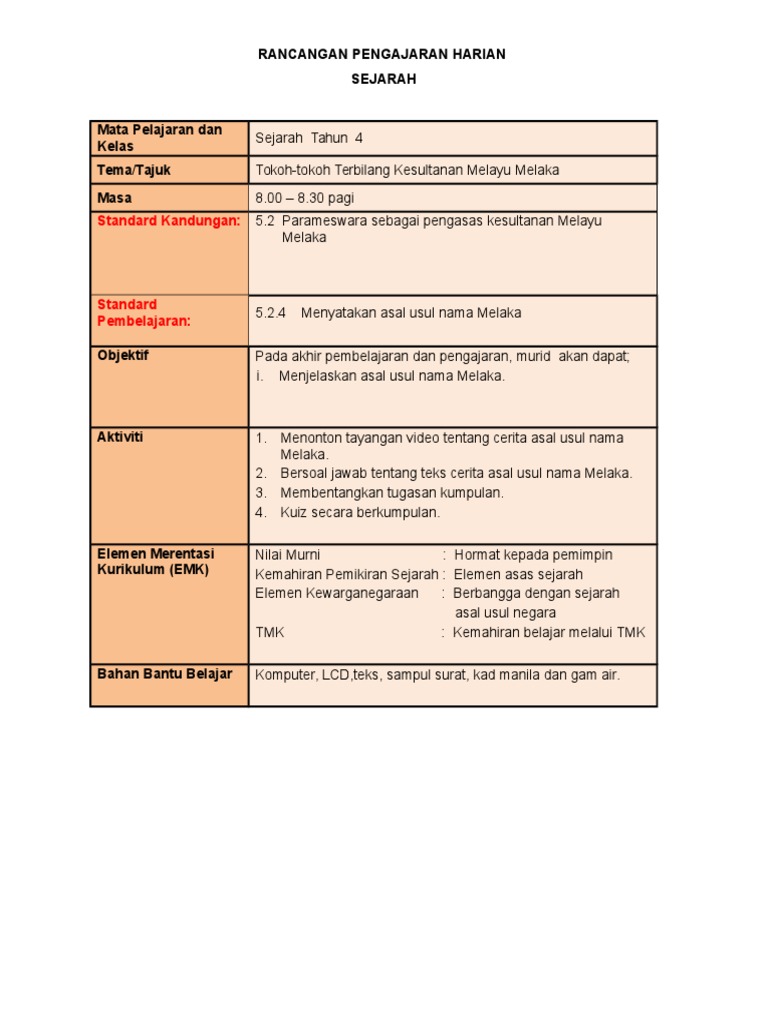 Standard Kandungan Rancangan Pengajaran Harian Sejarah