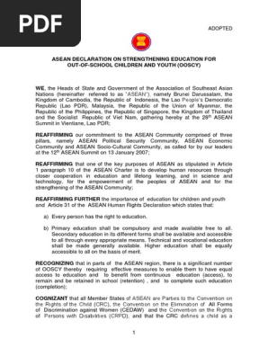Asean Declaration On Ooscy Adopted Association Of Southeast Asian Nations Social Exclusion