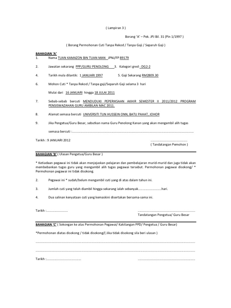 Doc Borang Permohonan Cuti Tanpa Rekod Mengikut Perintah Am Bab C Pekeliling Perkhidmatan Pekeliling Am Diisi Dalam 3 Salinan Uhisyam Sriib Academia Edu