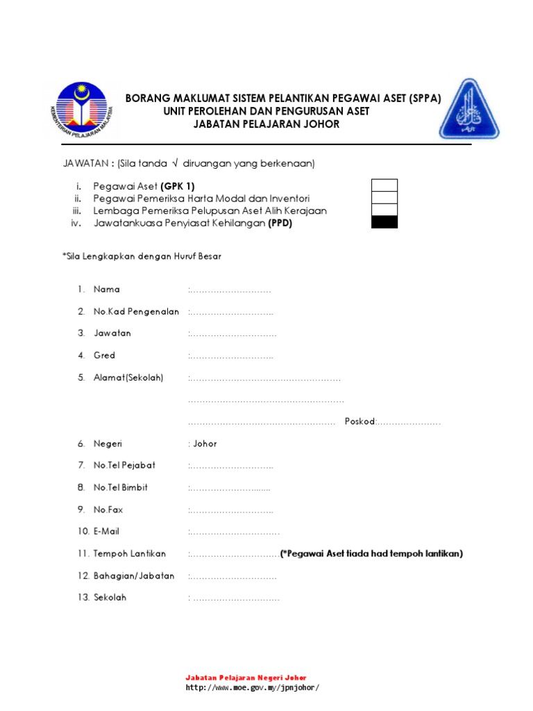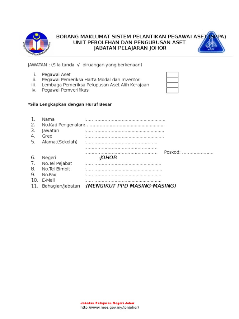 Borang Maklumat Sistem Pelantikan Pegawai Aset Sppa Unit Perolehan Dan Pengurusan Aset Jabatan Pelajaran Johor