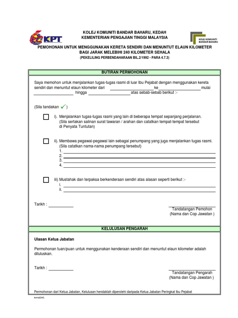 Borang Menggunakan Kenderaan Sendiri 240 Km