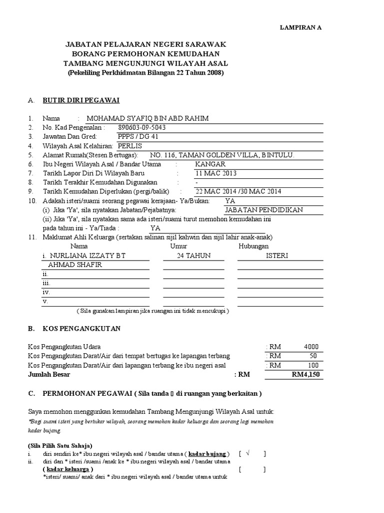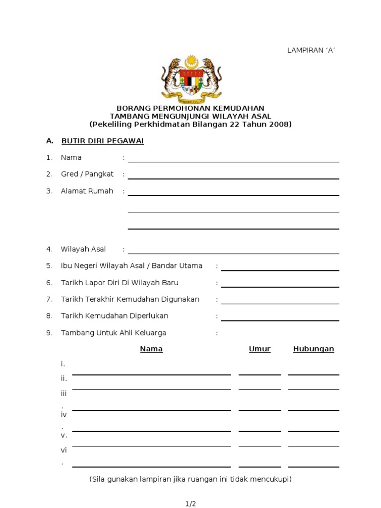 Borang permohonan kemudahan tambang mengunjungi wilayah asal lampiran a 1. Borang ini hendaklah diisi oleh pegawai beserta dengan borang. 1 lampiran a borang permohonan kemudahan tambang mengunjungi wilayah asal pekeliling perkhidmatan bilangan 22 tahun 2008 sila gunakan lampiran jika ruangan ini tidak mencukupi. Borang permohonan tambang percuma.
