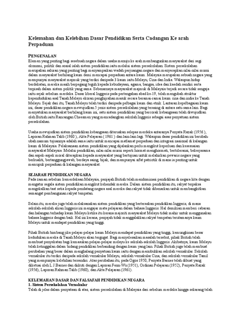 Kelemahan Dan Kelebihan Dasar Pendidikan Serta Cadangan Ke Arah Perpaduan