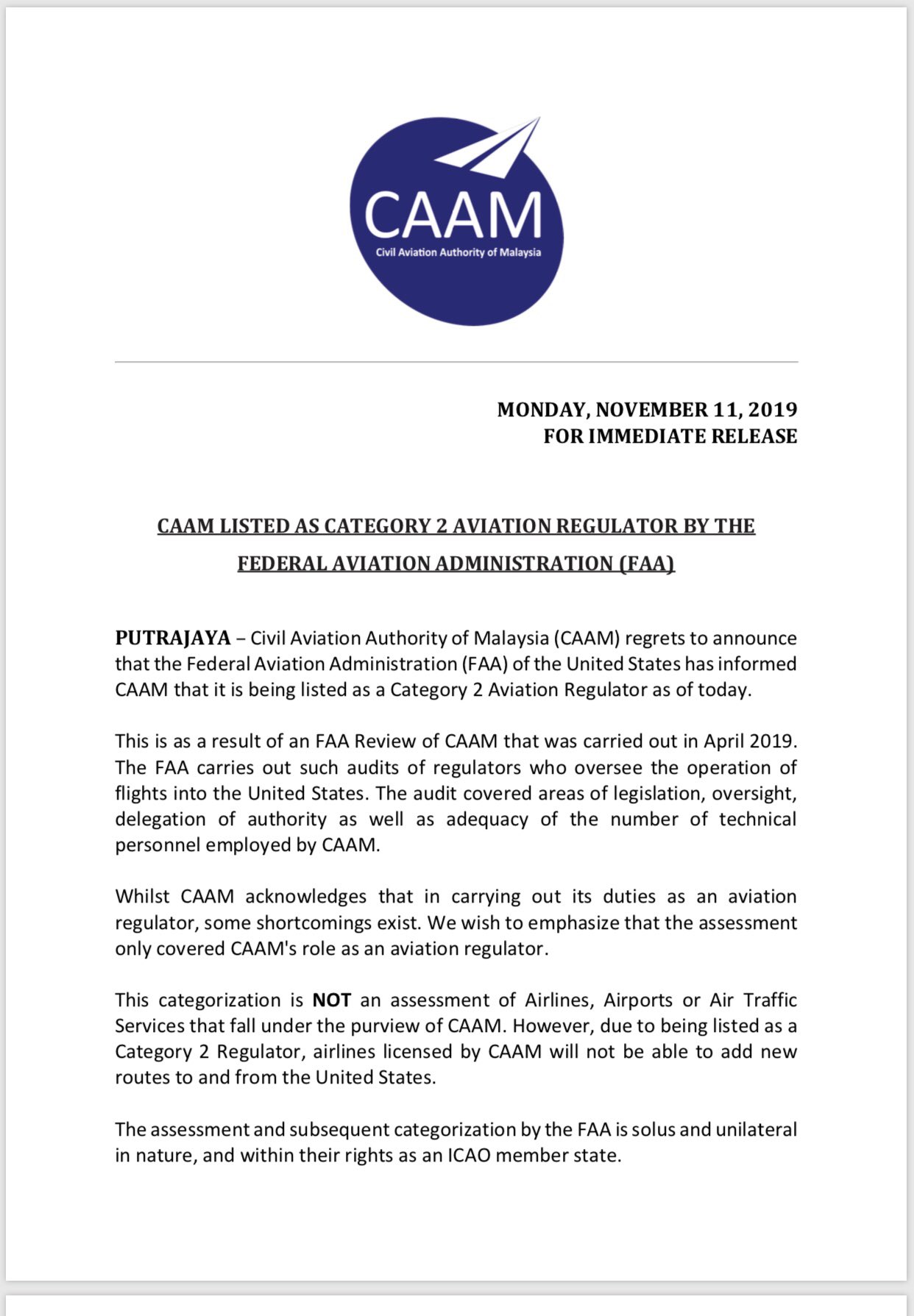 Melissa Goh On Twitter Malaysia Civil Aviation Authority Caam Hopes That Faa Will Reinstate Its Category 1 Status Within 12 Months Meantime Due To It Being Listed As A Category 2