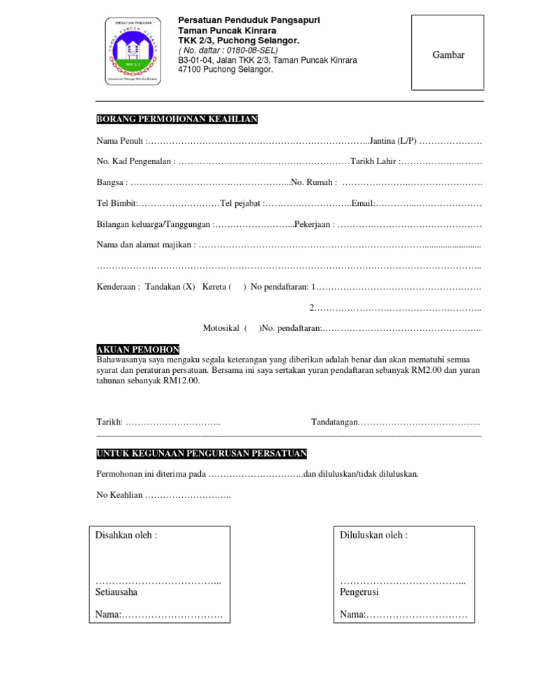 Borang Keahlian Persatuan Penduduk Tcs Borang Keahlian
