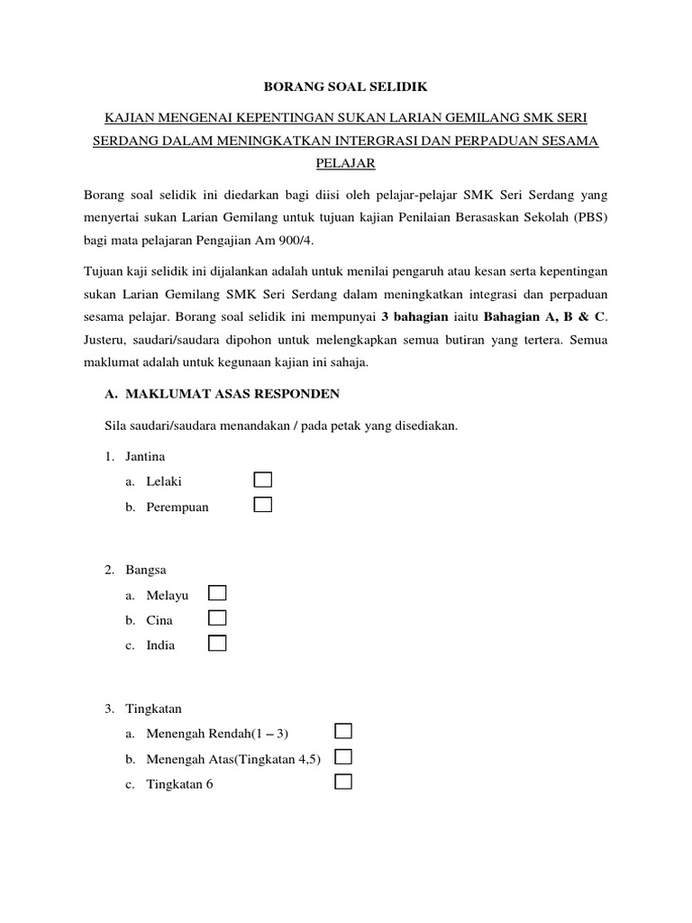 Contoh borang soal selidik pengajian am. Penggunaan gelanggang serba guna dalam kalangan pelajar tingkatan lima di smk baru miri sarawak. Perkongsian maya bahan bahan kerja kursus pbs dan nota pengajian am friday 18 january 2013. Nama penyelidik nama informan tarikh temubual tempat temubual. Soal selidik ini bertujuan untuk mendapatkan maklumat tentang satu tinjauan tentang peranan permainan catur dalam mewujudkan semangat kekeluargaan dalam kalangan pelajar asrama smk tambunan maklumat yang diperoleh daripada kajian ini adalah sulit dan hasil kajian ini digunakan untuk laporan kerja projek subjek pengajian am 900 4.