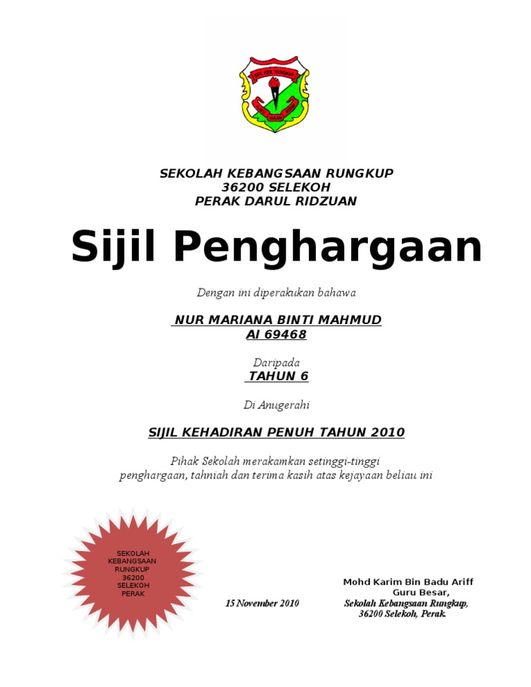 Sijil Penghargaan Kehadiran Penuh Smk Bukit Rokan 1