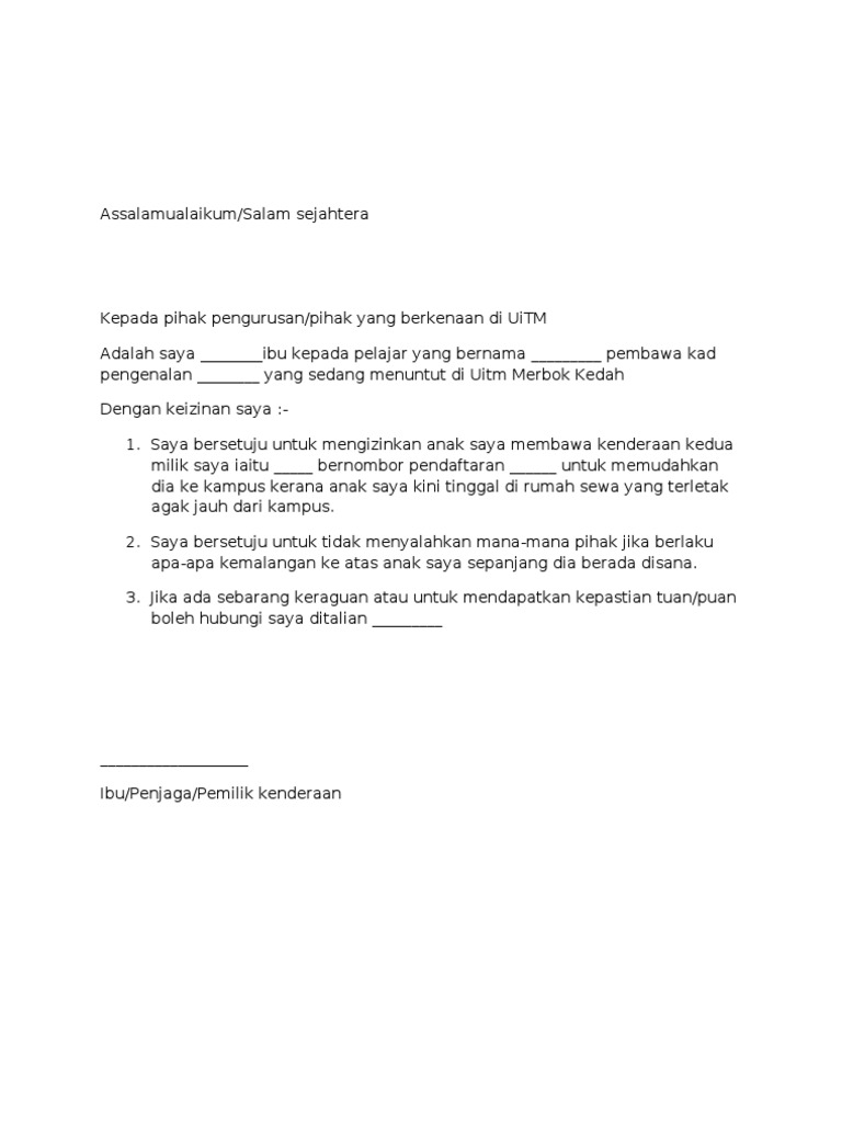 Contoh Surat Kebenaran Ibu Bapa Membawa Kenderaan