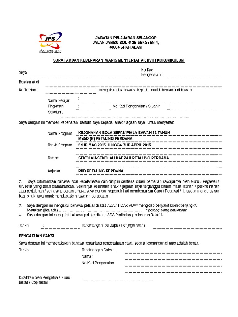 Surat Akuan Kebenaran Waris Menyertai Aktiviti Kokurikulum