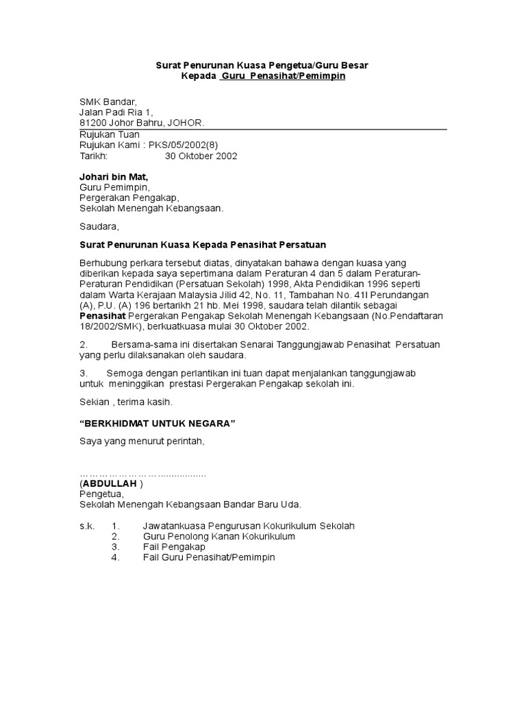 Contoh Surat Penurunan Kuasa Pengetua Guru Besar Kepada Ahli Jawatankuasa
