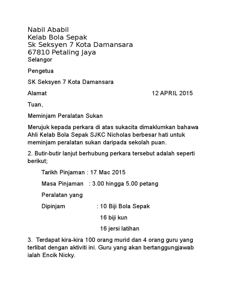 Surat Permohonan Pinjam Alatan Sukan Docx Document
