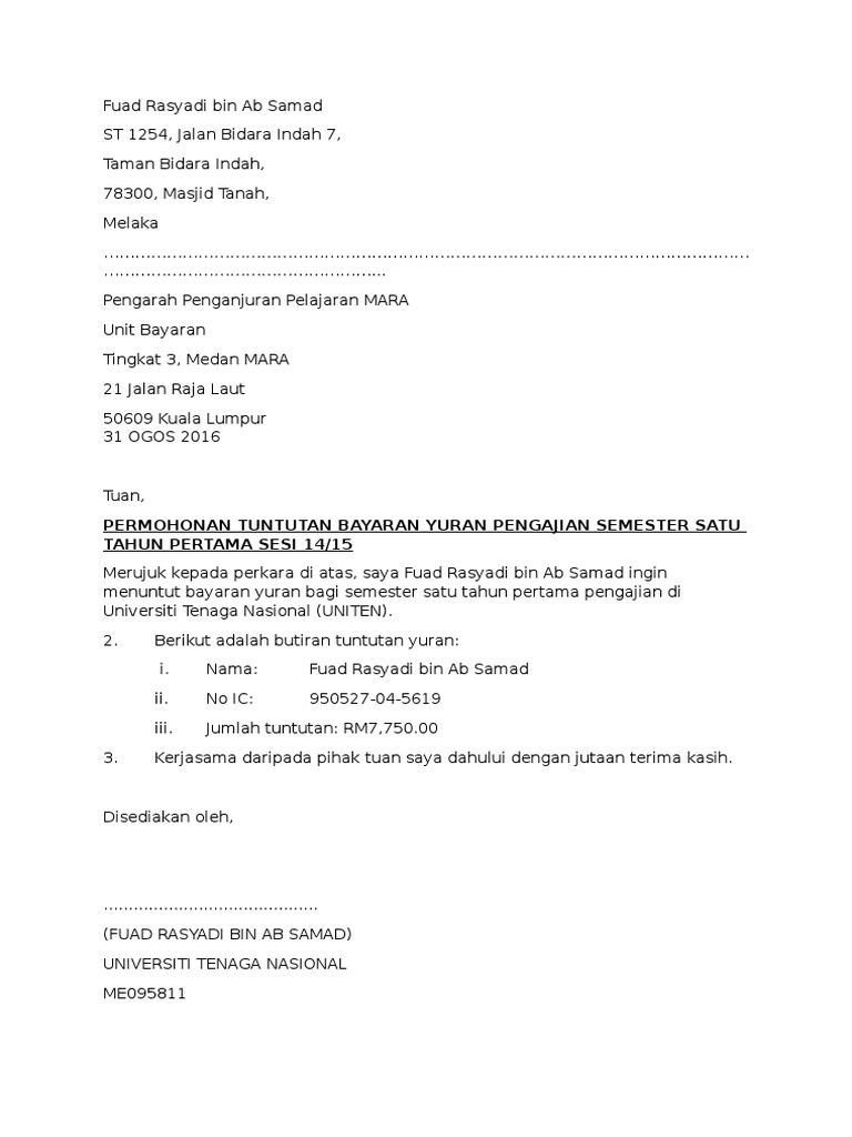 Contoh Surat Rasmi Permohonan Tuntutan Bayaran Surat Rasmi I