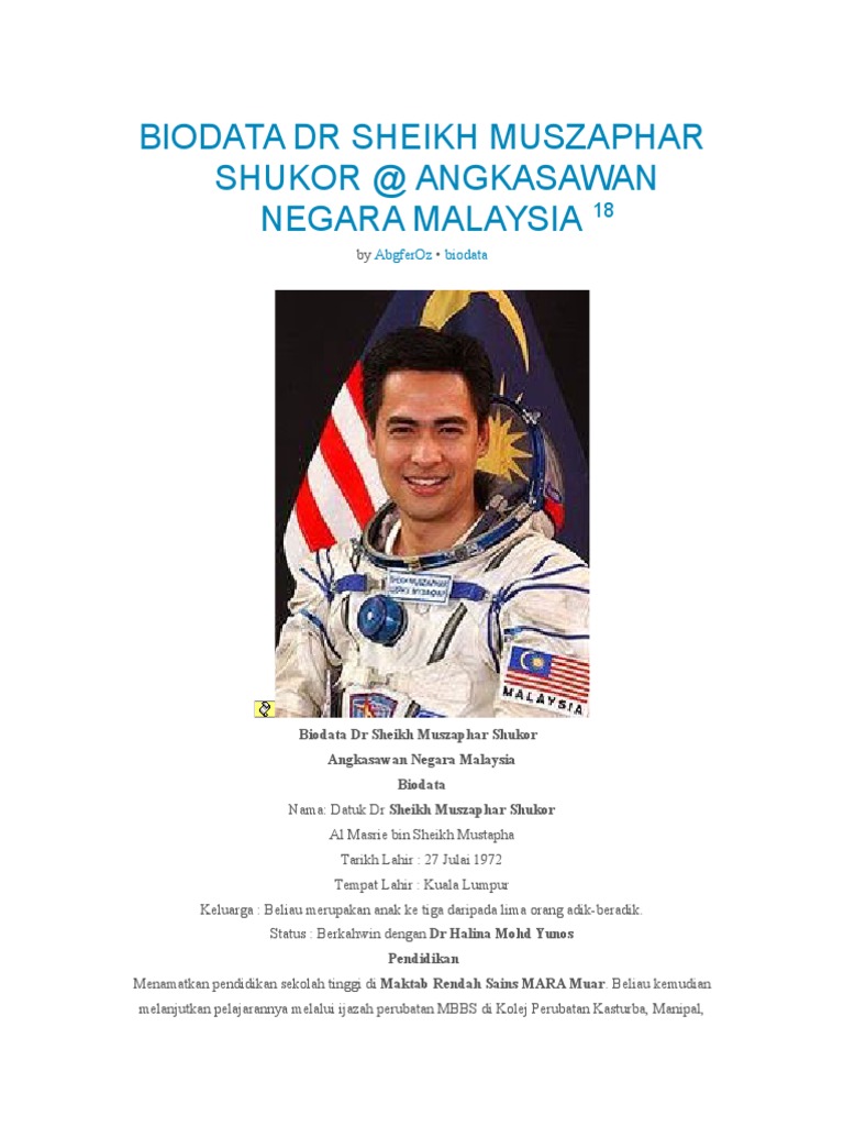 Tokoh Angkasawan Malaysia Biodata Datuk Dr Sheikh Muszaphar Shukor