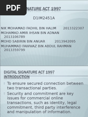 The digital signature act 1997 dsa 1997 which came into force on 1st october 1998 with the purpose of regulating the use of digital signature in malaysia ensures the security of legal issues related to electronic transactions and verifies the use of digital signatures through certificates issued by licensed certification authority ca. It specifically identified the importance and legitimacy of electronic signatures and records assuming contract participants agree to use electronic documents and esigning. Electronic commerce9 seal 10. An act to make provision for and to regulate the use of digital signatures and to provide for matters connected therewith.