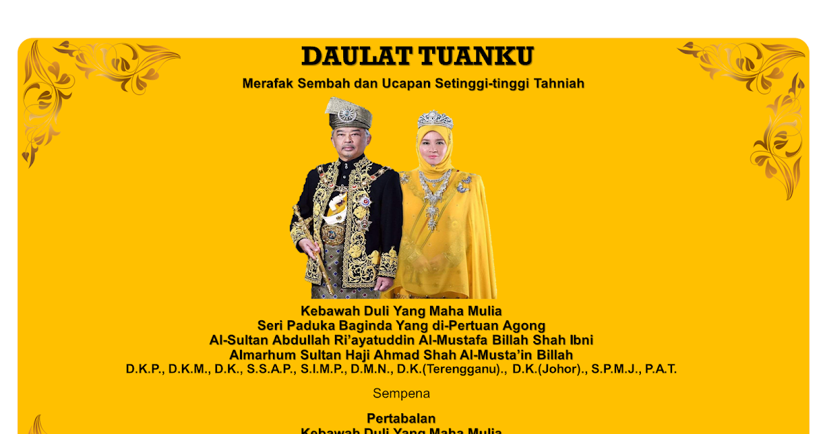 Merafak Sembah Setinggi Tinggi Tahniah Kebawah Duli Yang Maha Mulia Seri Paduka Baginda Yang Di Pertuan Agong Xvi Al Sultan Abdullah Ri Ayatuddin Al Mustafa Billah Shah Ibni Almarhum Sultan Haji Ahmad Shah Al Musta In Billah Dan Kebawah