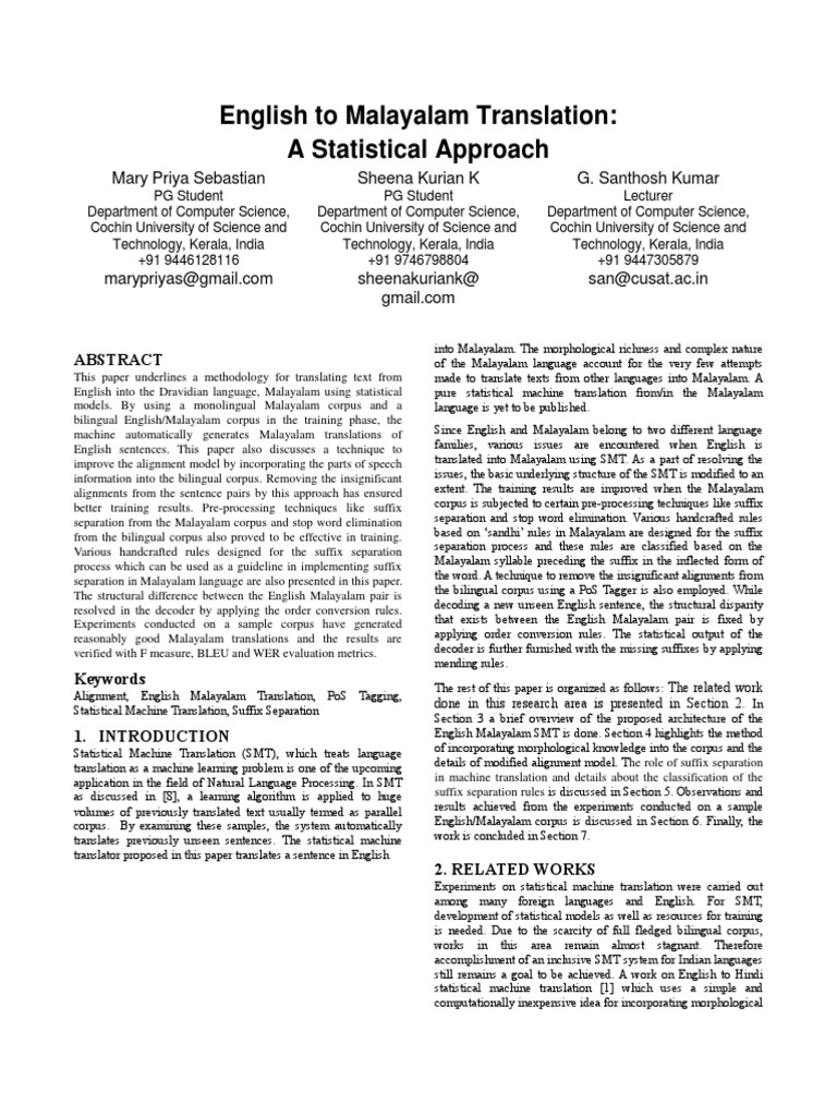 Below Shows The Sample Output Of The English To Malayalam Translation Download Scientific Diagram