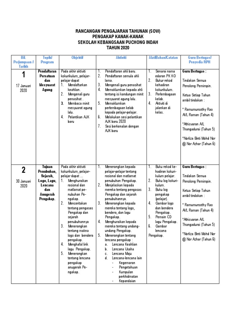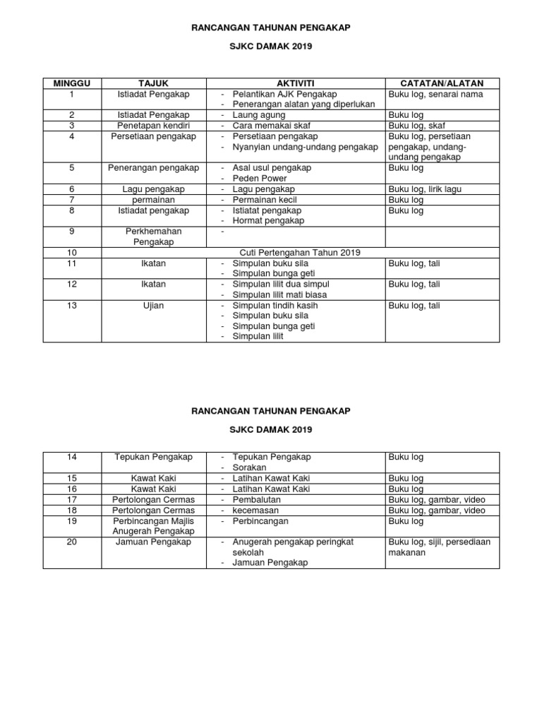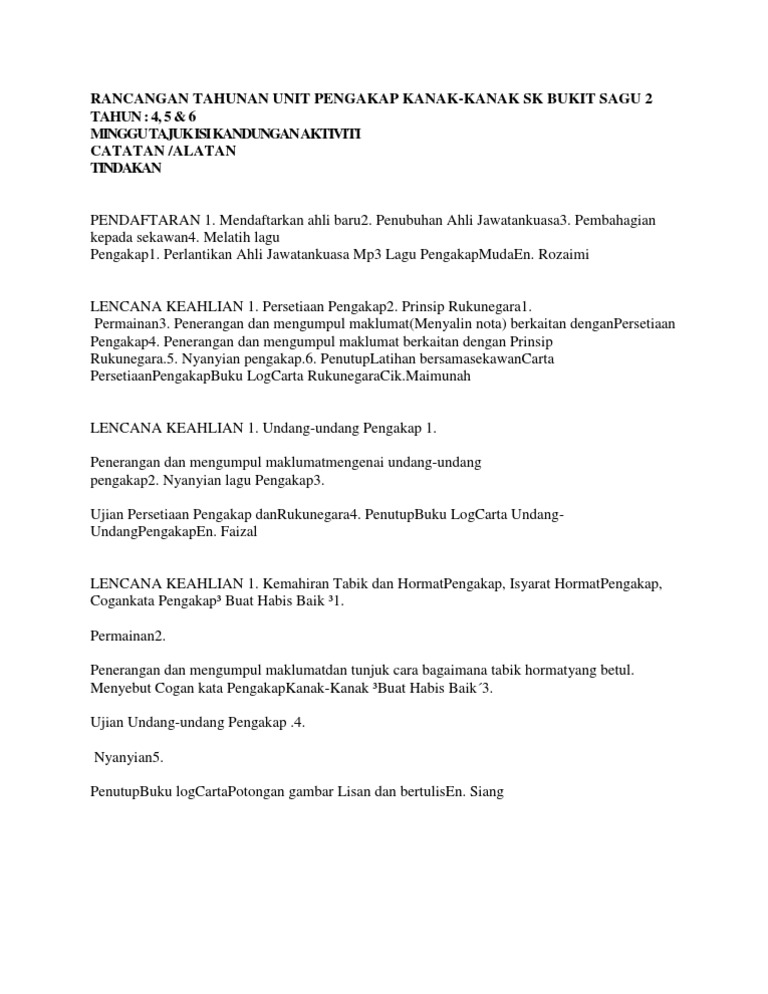 Rancangan Tahunan Unit Pengakap Kanak Kanak Sk Bukit Sagu 2 Tahun 4 5 6 Minggu Tajuk Isi Kandungan Aktiviti Catatan Alatan Tindakan