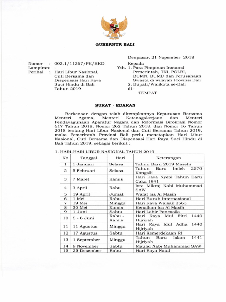 Surat Edaran Gubernur Bali Tentang Hari Libur Nasional Cuti Bersama Dan Dispensasi Hari Raya Suci Hindu Di Bali Tahun 2019 65 Pdf