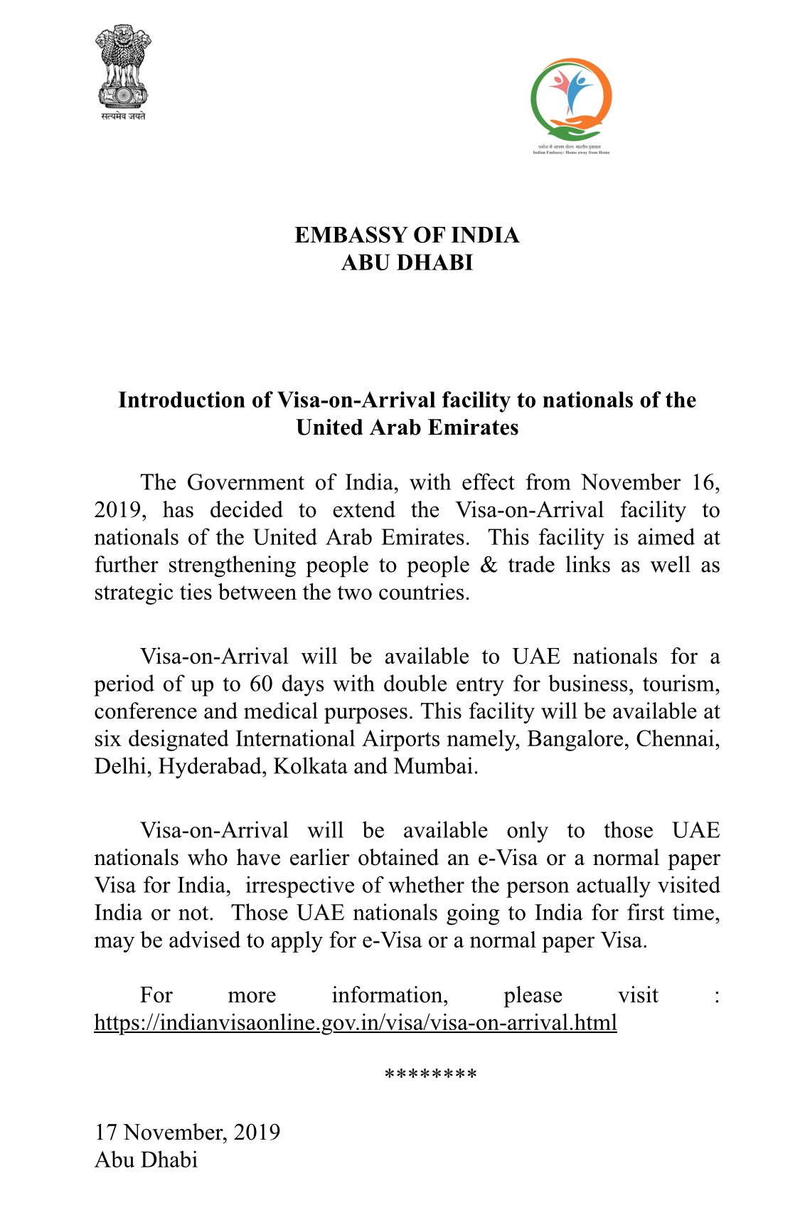 India In Uae On Twitter Introduction Of Visa On Arrival Facility To Nationals Of The United Arab Emirates Ambkapoor Cgidubai Indiandiplomacy Https T Co Ebvste9nck